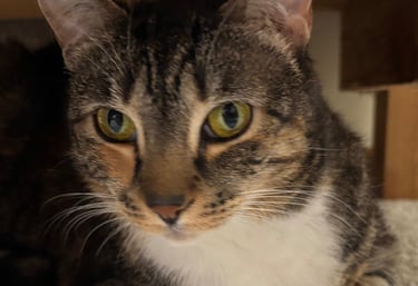 Dora is a street-smart little girl with a heart of gold! She arrived a little wary, already spayed and having found a woman who fed raccoons and invited her to eat too! She has been with us over six months and has just become so sweet, but still independent! If you can't find her... she may be in a cupboard or above the refrigerator but she will come find you for attention, dinner and playtime! She is about 2-3 years old and healthy!